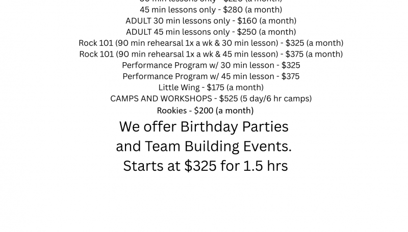 30 min lessons only - $220 (a month) || 45 min lessons only - $280 (a month) || ADULT 30 min lessons only - $160 (a month) || ADULT 45 min lessons only - $250 (a month) || Rock 101 (90 min rehearsal 1x a wk & 30 min lesson) - $325 (a month) || Rock 101 (90 min rehearsal 1x a wk & 45 min lesson) - $375 (a month) || Little Wing - $175 (a month)