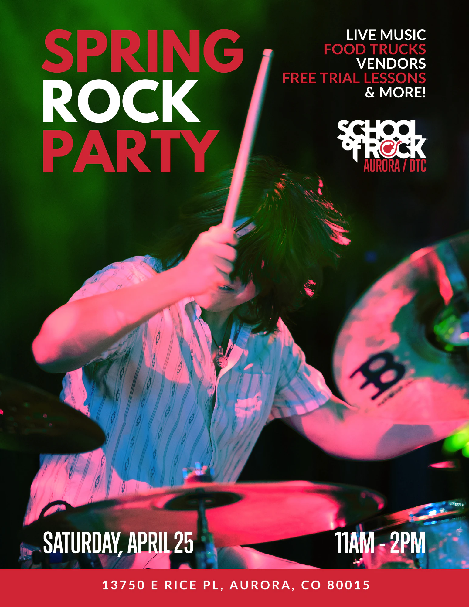 The event will take place on Saturday, April 25, 2026, from 11:00 AM to 2:00 PM at School of Rock Aurora (13750 E Rice Pl, Aurora, CO, 80015).