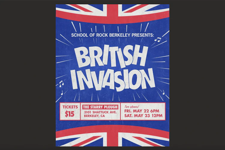 School of Rock Berkeley will perform live, on 5/8, 5/9, 5/22, 5/23, 5/29 and 5/30 for all seasonal performances at Starry Plough Pub. Our British Invasion group will perform at 6pm on 5/22 and 8pm on 5/23, celebrating this season! This group will pay tribute to many of the foundational artists who popularized the rock genre in Britain in the late 60s and early 70s, including the Beatles, The Who, and many more.