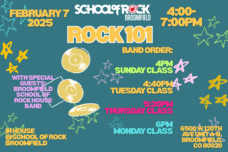 Four fabulous Rock 101 bands will perform Saturday Feb 7 from 4-7pm, right here at the SoR Broomfield location! Each band plays for approximately 30 minutes, and feature a selection of classic rock and roll favorites. Our House Band students will make a special appearance in between sets to demonstrate what the journey from Rock 101 to advanced musician looks like!