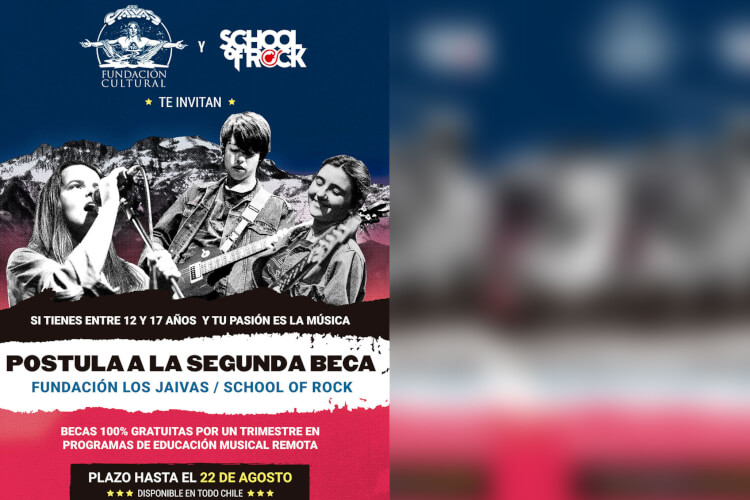 Dado al éxito de su primera convocatoria realizada el año 2020, en la cual postularon más de 700 niñas, niños y jóvenes de todo Chile, Fundación Cultural Los Jaivas y la academia internacional de música School of Rock, lanzan ahora la segunda edición de su beca de educación musical, iniciativa que tiene por objetivo apoyar gratuitamente el desarrollo y perfeccionamiento musical de jóvenes talentos de todo Chile.