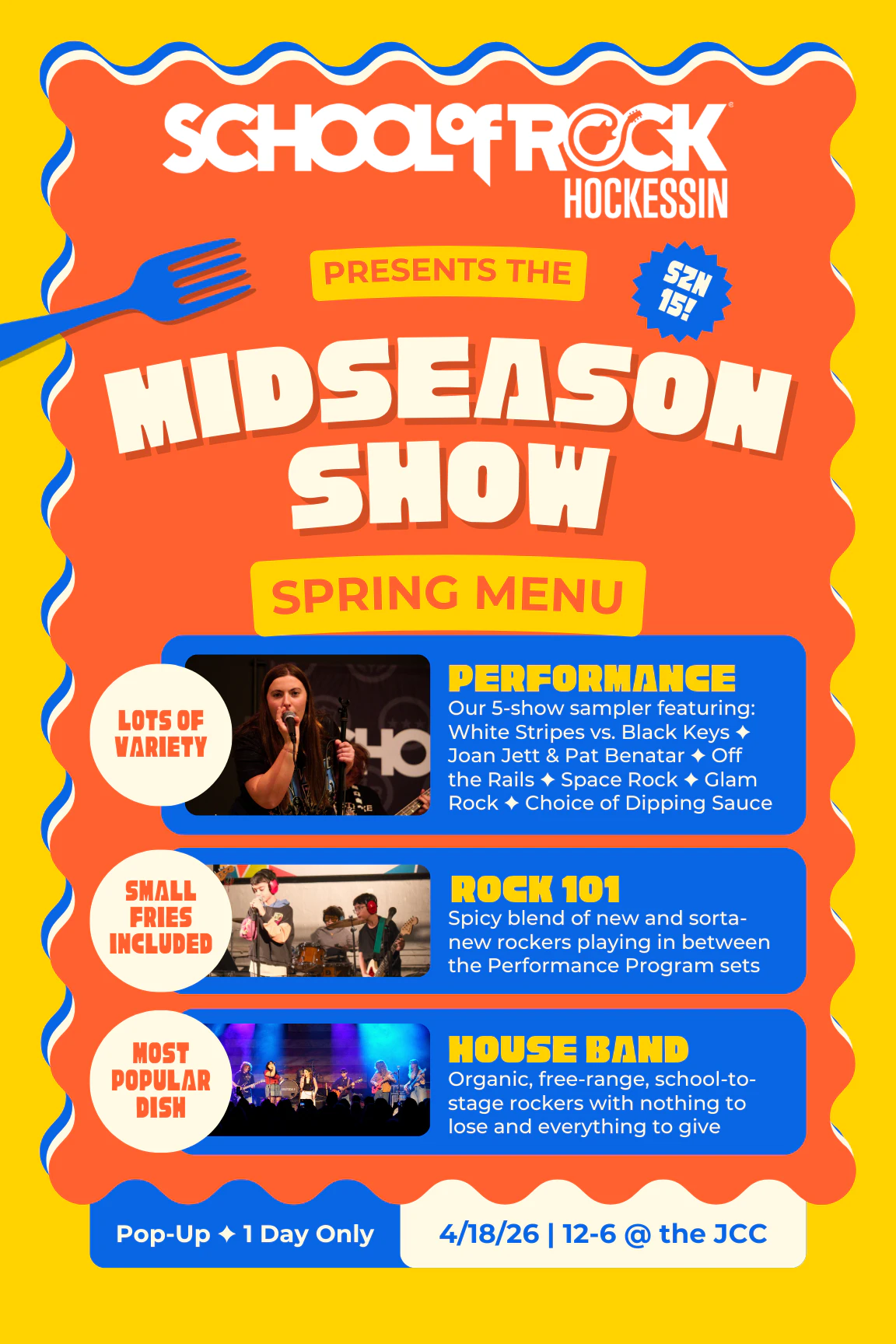 Rock 101 and Performance students are serving up some hot, fresh tunes for an epic spring show! Midseason Shows put fun on the menu: students have been rehearsing together since February and show us what they've got so far. Good vibes, good music, GREAT families. And as usual, we'll be selling hot dogs and snacks to support our House Band's summer tour, North Star.