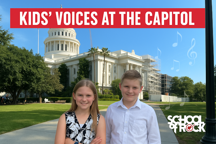 Roseville (CA) – Earlier this month, two students from School of Rock Roseville took their message of the importance of music education all the way to the State Capitol.