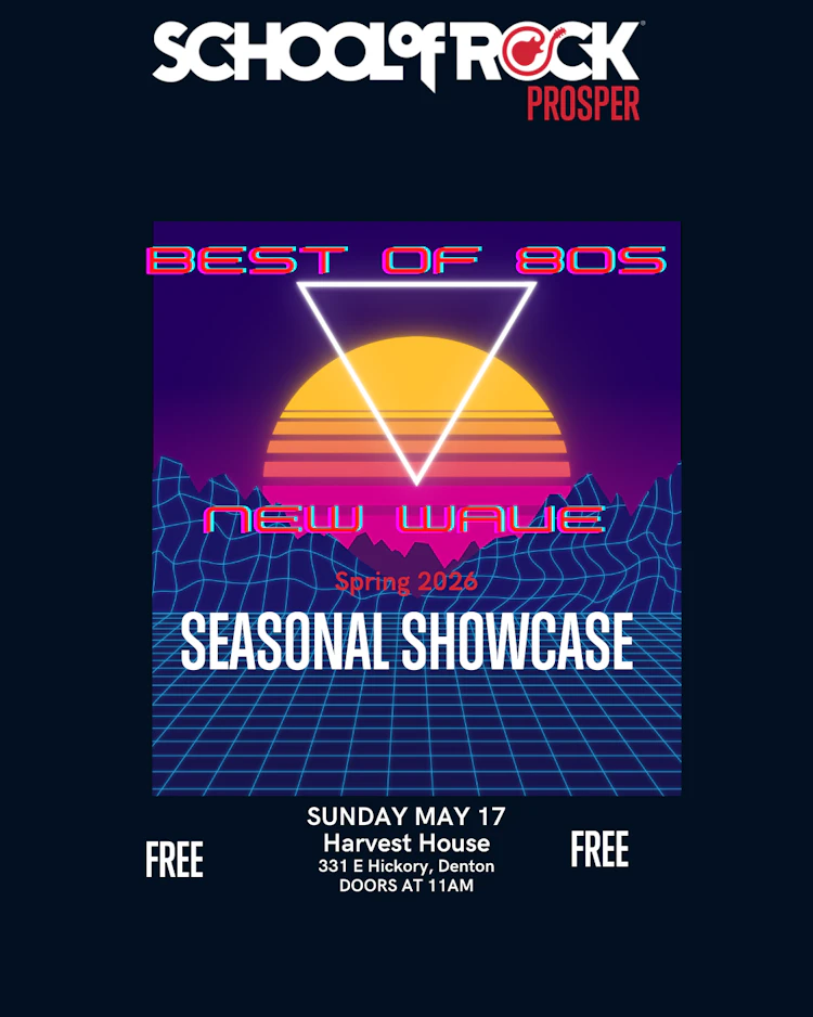 WHEN: Sunday May 17, 11am-6pm WHERE: Harvest House, 331 Hickory St, Denton WHO: All of our Rock 101, performance and adult bands will perform TICKETS: tickets, posters and t-shirts are included in seasonal show fees. DRESS CODE: dress like a rockstar!!!