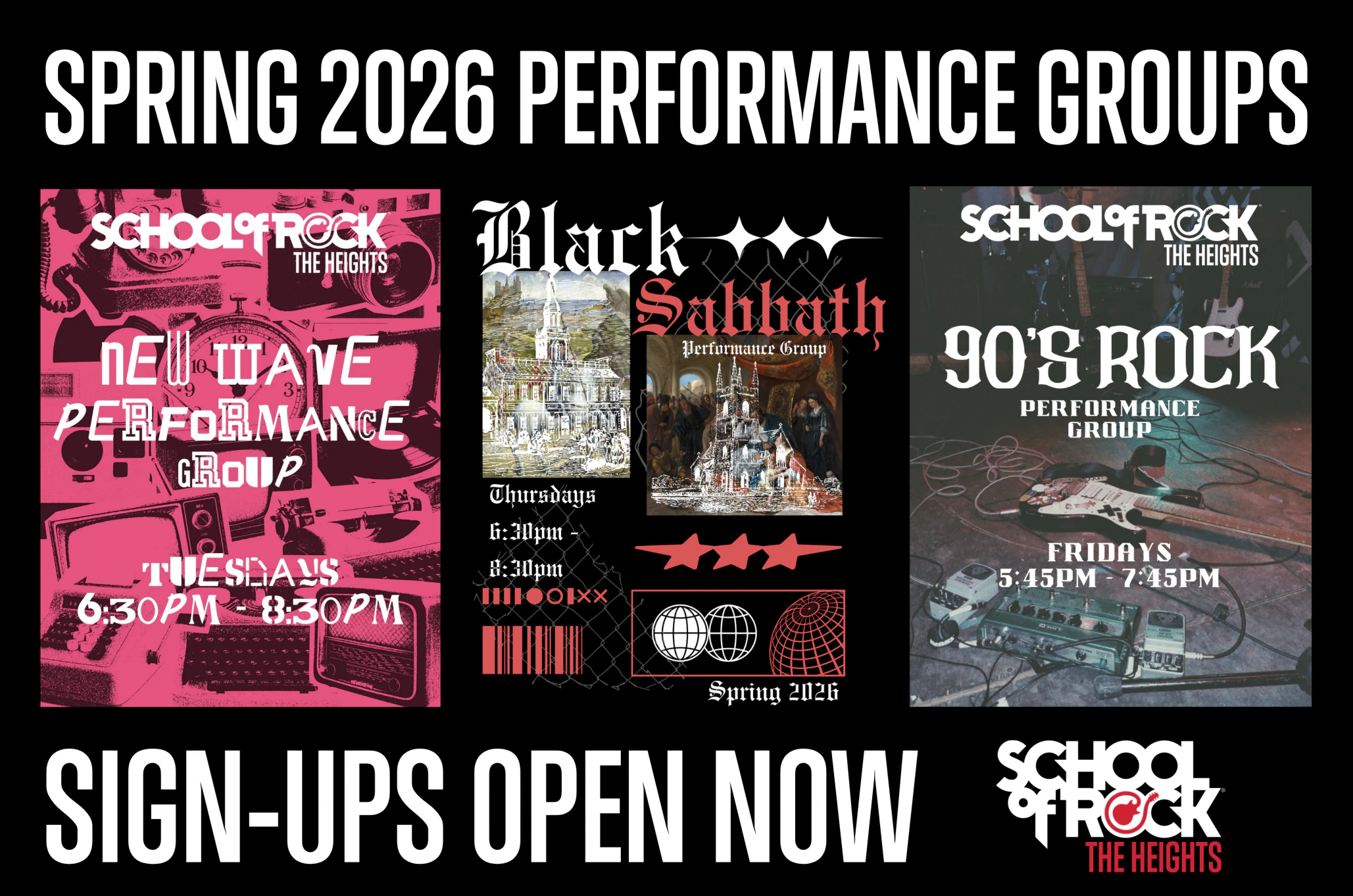 Sign-ups for our Spring 2026 Performance Groups are open now. Come see us at the front desk and we will get you sorted. If you have interest in the new Rock 101 group, we can switch you over from an existing group, or enroll you into the new time or any others for any new students. We're looking forward to the new season with all of you and all the fun we're going to have. Let's Rock!