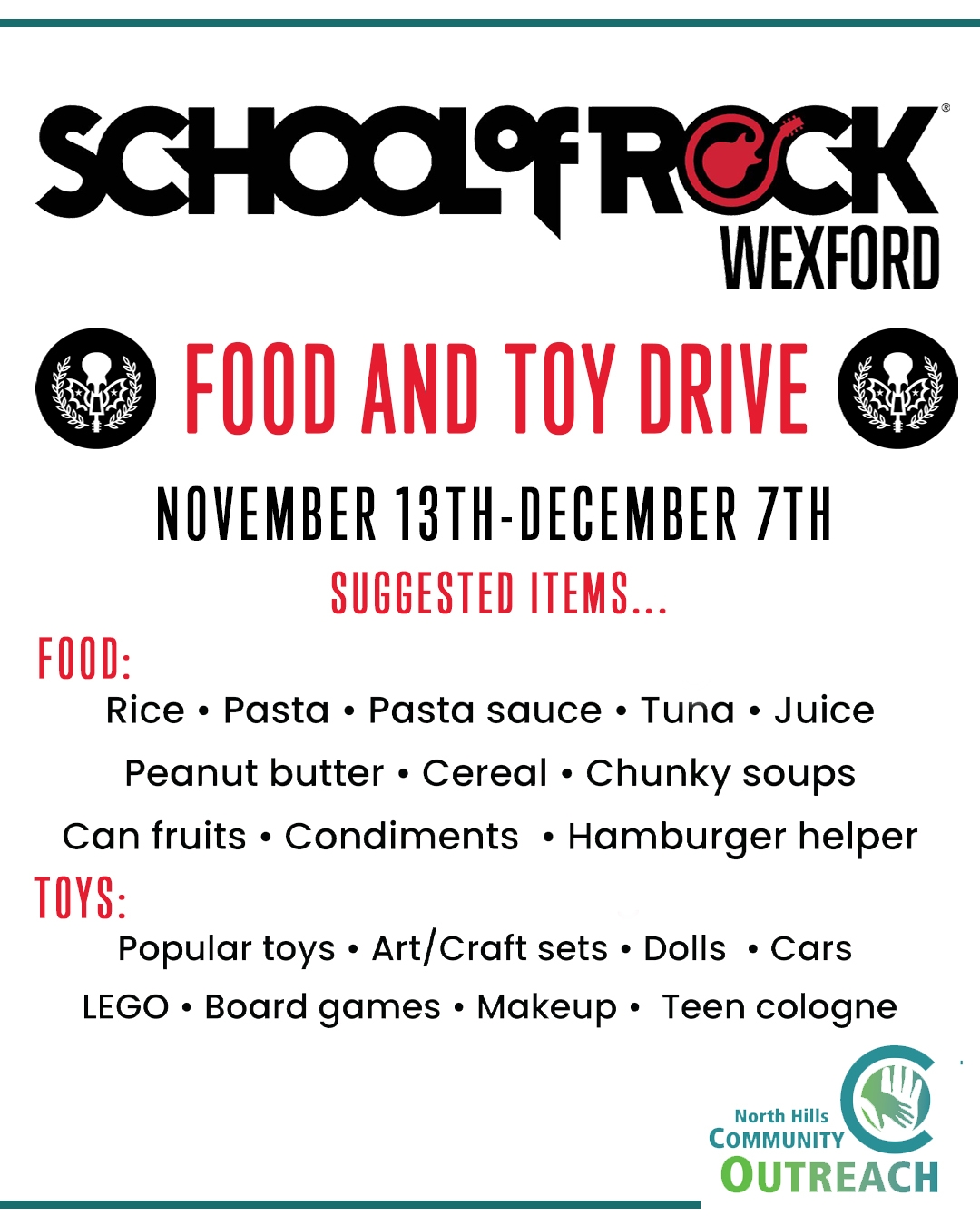 We are partnering with the North Hills Community Outreach this Holiday season! Come drop off a much needed food item or toy and spread the Holiday spirit to our community! Our drive will culminate at our first ever School of Rock Jingle Jam!